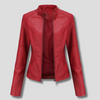 Chaqueta de motociclista de cuero roja ajustada para mujer